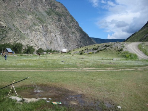 Салават провел водопровод от водопада пластиковой трубой через Чулышман к себе на базу )))) Вывел воду к домикам и просто в поле к подъему на перевал: