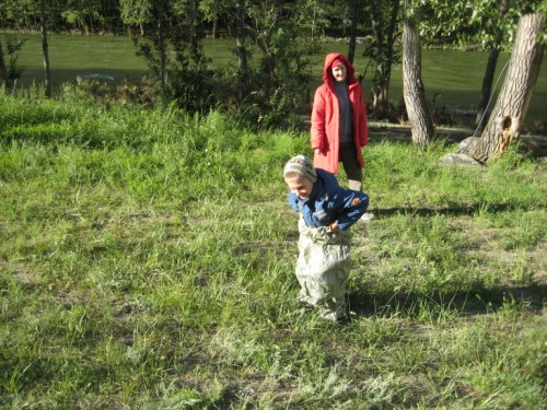 Салават продолжает строительство на базе, и заметив возде "пилорамы" гору опилок, я решил совместить приятное с полезным и устроил сыну забег в мешках до пилорамы с заданием притащить опилок обратно )))