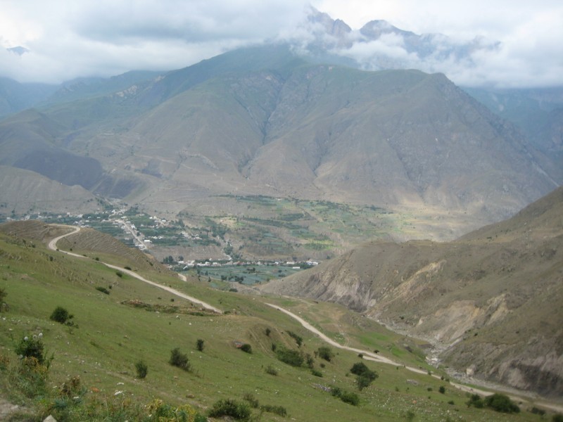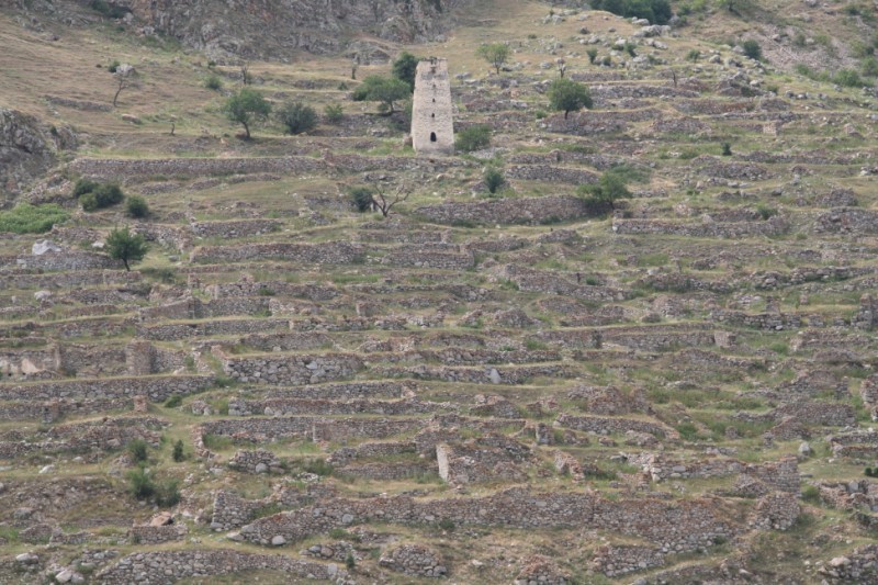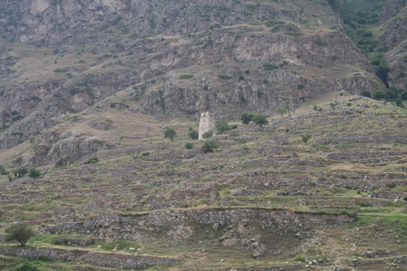 Спускаемся в селение и делаем осмотр местных достопримечательностей – древний разрушенный аул Ишканта и оборонительная башня Амирхана, сооруженная на огромном скальном обломке:
