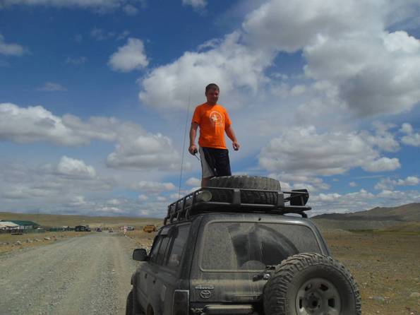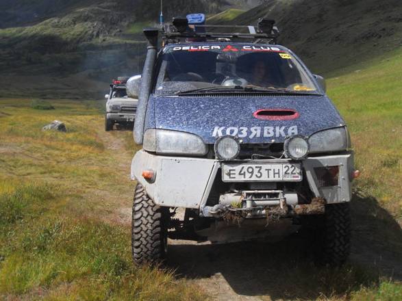 Погода хорошая, едем той же дорогой вдоль горы. Дорогой нас трясёт на камнях, местность то болотистая то песчаная. На одном из песчаных подъёмах мы на Козявке увязли в песке и только с попытки четвёртой смогли заехать в гору. Не помогала не блокировка не временное подключение переднего моста. Денис заметил что что-то начало сзади на авто постукивать, после осмотра выяснилось, что оторвано верхнее ухо заднего амортизатора. По связи предупредили ребят. Едем потихоньку, догоняем ребят недалеко от Бельтира. В деревне находим жителя, готового предоставить розетку на 220в (не хотелось ребятам доставать генератор, заливать бензин, потом сливать). Денис быстренько переваривает ухо на амортизаторе, вставляет на место, и мы едем дальше.