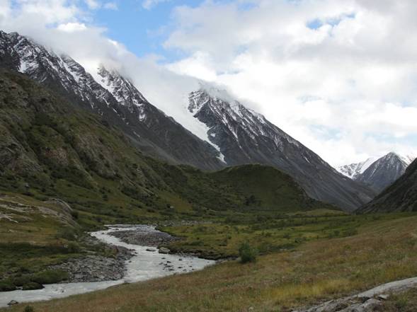 В 15 часов мы отправились в дорогу на ледники. Через 10 минут поворачиваем налево в д. Бельтир. Километров 6-7 идёт асфальт, потом гравийка, по бокам – степь, впереди – горы. Облака очень низко, всё небо устлано ими, кажется, что заедем в облака прямо на машине. После 16-го километра опять пошёл асфальт, мы поднялись немного вверх.