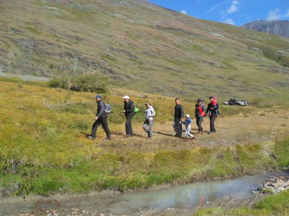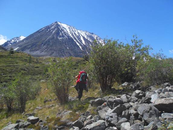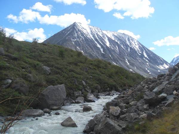 Дорога наша проходила вдоль речки вперёд к заснеженным вершинам, но сам Софийский ледник ещё видно не было. Сначала шла болотистая местность, мы прыгали с кочки на кочку, чтобы не промочить ноги. Серёга нёс на плечах Андрея, а Дима – Полину, но периодически ребятишки всё же шли пешком, там, где это позволяла дорога. Где было возможно, мы шли по краю речки, где воды было много – поднимались вверх на холмы пробираясь сквозь кустарники. Тропы здесь уже есть, главное – выбрать самую удобную.