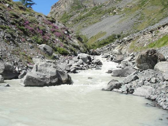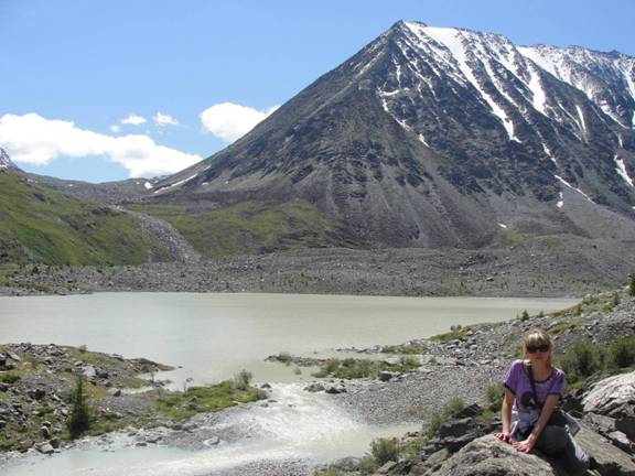 Через некоторое время мы добрались до озера, с которого очень хорошо просматривался ледник. Встретили туристов из Паджеро Спорт, они собирались купаться. А мы не рискнули. Бр-р-р-р-р, кажется, это для моржей! На другом берегу в бинокль мы разглядели туристов подмосковных. Вчера они ходили той же дорогой, что и мы, а сегодня решили сменить обстановку и "прогуляться" по правому берегу реки и, соответственно, обходили озеро по другой стороне.