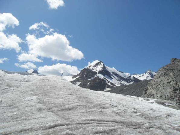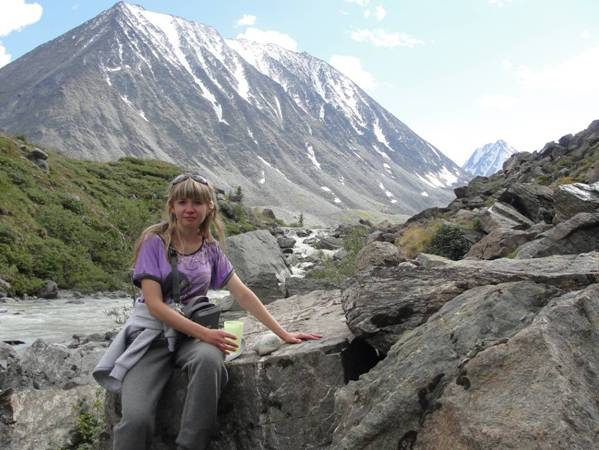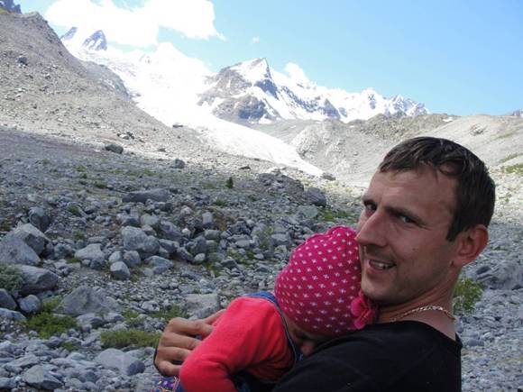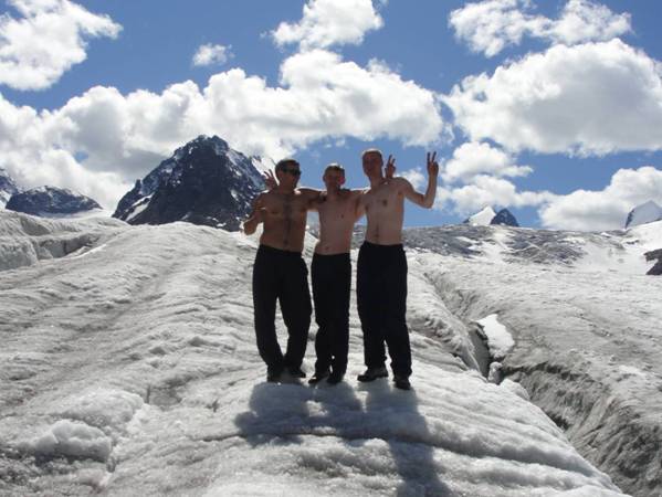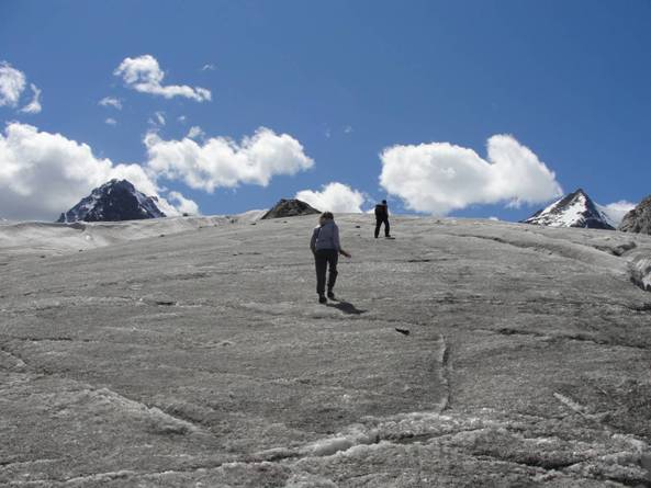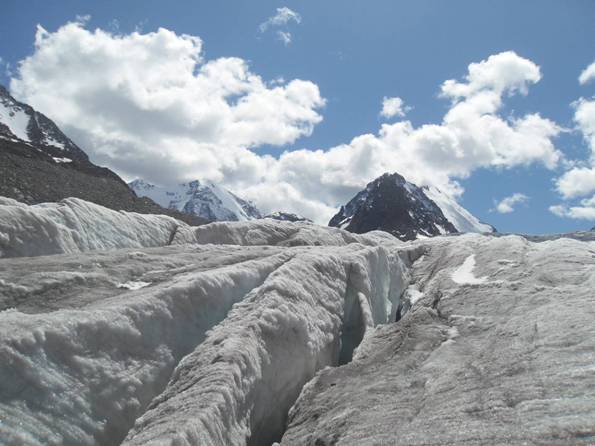 Ледник – это не гора со снегом наверху, как я думала раньше, это гора вся изо льда. Ледник тает и образует речку, которая выходит прямо из под него. Эти воды вымывают ледник у подножия, образуя красивые пещерки. Поверхность ледника грязная, пыльная, мы пошли вверх, добираться до чистого снега. Подъём очень крутой, после первых ста метров делаем передышку, Аня остаётся здесь. Ещё 100 метров, останавливаемся, дальше идти без спецснаряжения нежелательно. До чистого льда мы не дошли, лишь встретили несколько островков свежевыпавшего белого снега. Но всё же мы на леднике! Урааааааа!!! Дима с Полиной, Антон с Натальей, мы с Денисом и Аня машет нам снизу. Фотографируемся, разглядываем трещины и разломы, которые уходят в глубину. Собственно по ним вода и стекает вниз, образуя речку.