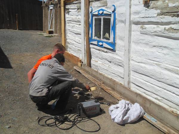 Фото № 3. Денис приваривает ухо на амортизаторе, местный житель ему помогает.