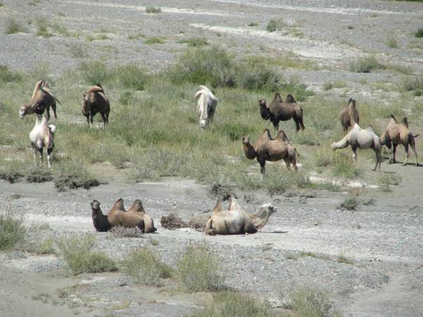 В этот раз мы уже выезжая с деревни сворачиваем на право, это дорога на Талдуринский ледник и Карагемский перевал. То есть через деревню мы не проезжаем, после сварочных работ возвращаемся назад на развилку. Справа пасутся верблюды возле реки Талдуры, а слева в горах растут деревья. При виде дров останавливаемся, собираем.