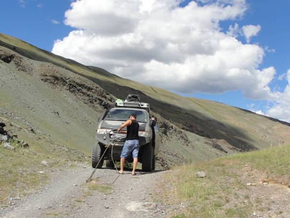 Дорога пошла по болту, по довольно глубоким следам от ГАЗ-66. После очередного киш-миша нас заносит, боимся трогаться с места, машину на заднем приводе разворачивает в сторону крутой канавы, наверняка стащит туда или перевернет. Серёга нас на лебёдки пытается от туда вытянуть, так как мы уже ловим очень сильный крен в канаву.