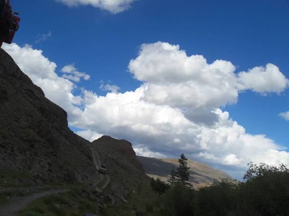 Впереди на нашем пути брод через реку Джело, здесь развилка на Карагемский перевал и Талдуринский ледник. Ребята вышли на разведку брода. Нам повезло, что уровень воды в Джело был маленький, порядка 60 см, и мы преодолеваем его друг за дружкой (в том числе и мы на заднем приводе) без проблем. На часах 14:50, на развилки поворачиваем на лево в сторону Талдуринского ледника. Перед нами начинается очень крутой подъём в гору. Козявка с трудом поднимается, колёса постоянно шлифуют. Передний мост мы уже не включаем так как он уже отжил своё. Дима на Дэлики-Монстре не смог подняться, ему не хватало тяги из за неисправности в топливной аппаратуре. Поэтому Антон на Корандо тащил его на буксире. Подъём и спуск был порядка 40 – 45 градусов.