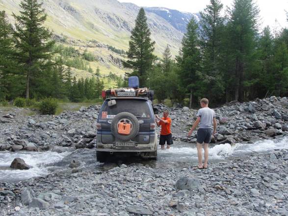 Далее грязевой ров, ребята едут без видимых затруднений, а мы - с помощью блокировки преодолеваем препятствие с четвёртой или пятой попытки. Опять на пути речка, широкая и с несколькими руслами. Ребята пошли на разведку, на той стороне реки была обнаружена дорога. Исследовав реку ребята предпринимают попытку её перебродить, встаем в колону и друг за другом переправляемся.