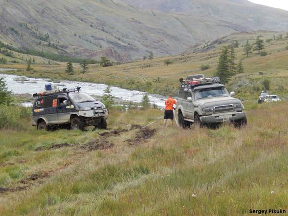 Дааа! Мы понимаем, что нам совсем будет плохо без переднего моста. Пару метров и опять сидим, и не какие блокировки в заднем мосту нам ни помогают. Лебедимся уже за дерево с помощью двух тросов по 30 метров и корозащитной стропы, так как спереди уже нет возможности не кому подъехать. Металлический трос не выдерживает и рвется, теперь ждём, когда нас догонят ребята. Время уже 17 часов, до стоянки километров 6, высота 2300 м. Вот и Антон подоспел. Антон как лягушка пропрыгивает по болоту и вот он уже впереди нас. Мы цепляемся к нему лебёдкой и потихоньку вытягиваемся из западни. Подтягиваются остальные и мы едим дальше.