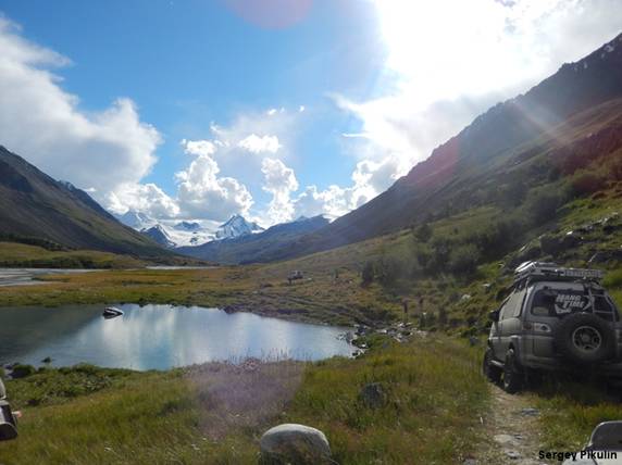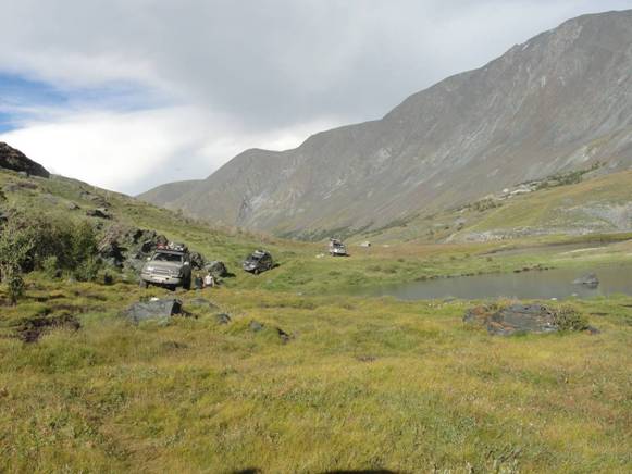 Есть опасность, что в грязевом заносе высокую узкую машину просто перевернет. Денис и Дима сходили на разведку вперед и сказали, что наши машины, на сегодняшний день, не готовы поехать в это болото, так как уже ещё и темнеет, и нету смысла ночевать в болоте. Решаем встать перед озером на стоянку, завтра пробовать ехать до ледника на Корандо и Лэнд Крузере. В 18:10 мы остановились на ночевку и дневку на высоте 2313 метров.
