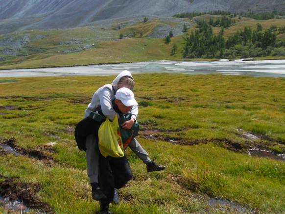 Сегодня у нас намечалась прогулка до ледника.После завтрака мы начали собираться. Из желающими оказались Антон с Наташей и мы с Денисом. С детьми решено было не ходить, поэтому остальные остались в лагере. Примерно в 10:30 мы вышли. Взяли с собой термос с кипятком, чай, кофе, воды и печенье. Хлеба оставалось две маленьких булки "бородинского", брать не стали, оставили на ужин. Я и Антон взяли по паре резиновых сапог, потому что в начале пути было болото, а потом - неизвестно что. Антон переносил Наташу на горбушке через грязь.