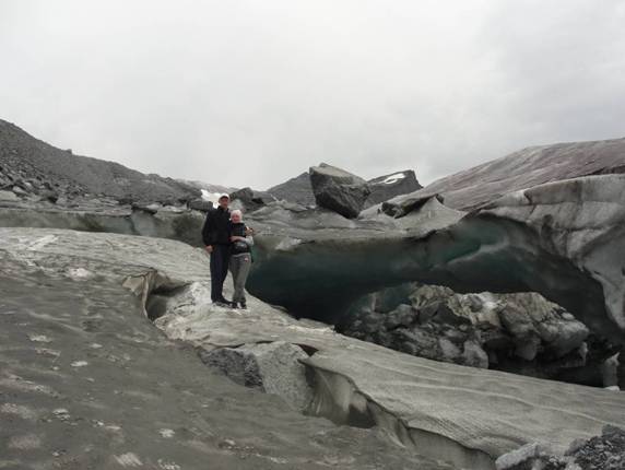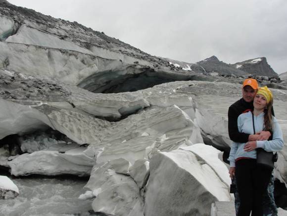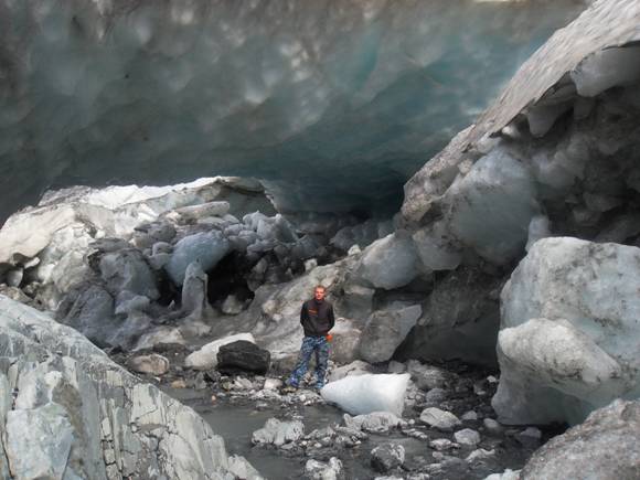 Но частые подъемы и спуски все-таки высасывают из нас силы. Мы с Наташей немного отстали от наших мужчин. Дорога пошла по полю с большими и маленькими камнями. Всё время, глядя под ноги, наши глаза натыкаются на разные красивые камушки. Я складываю наиболее понравившиеся в сапоги, которые висят у меня на шее, а Наташа набивает камнями карманы. В это время Антон и Денис уже сидят на камне перед ледником. Спустя минут пятнадцать, и мы добираемся до туда. Подкрепившись и попив кофе, мы пошли разглядывать ледник. Подъем на него был очень сложным и опасным, снег обрушался прямо на наших глазах. Мы поднялись метра на 10 вверх, рассмотрели разломы, пофотографировались. Вид здесь совсем не такой, как на Софийском леднике. Здесь было даже холоднее. Ледник был похож на большой айсберг сине-зеленого цвета. Внизу от обвалов образовались гроты, они очень красивые и интересные. Из-под ледника бежит река Талдура, вдоль которой и проходила наша тропа. С одной стороны снеговой выступ присыпан камнями, которые падают сверху с горы, снизу же лёд вымывает речка. Ледник сейчас тает: в гротах сверху капает вода, а в некоторых местах прямо из толщи льда текут тоненькие ручейки и стекают в реку. Немного мешает любоваться красотами ледника грязь, которая лежит на его поверхности, хочется посмотреть на белоснежный покров.