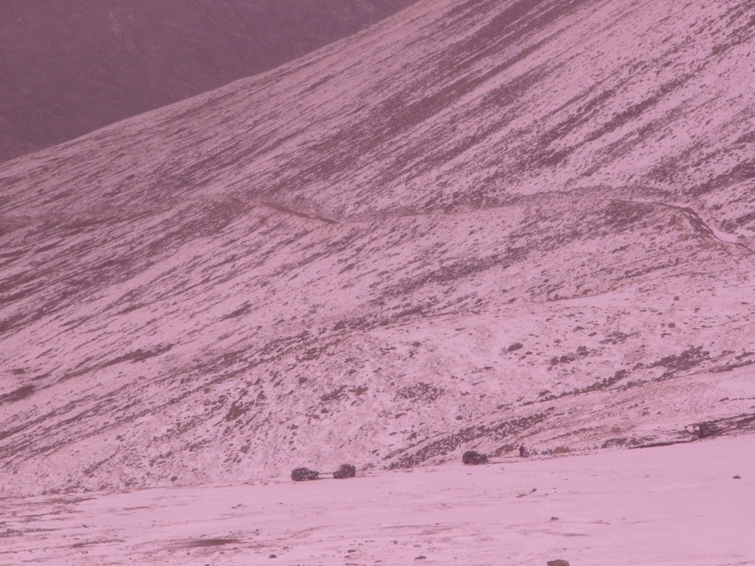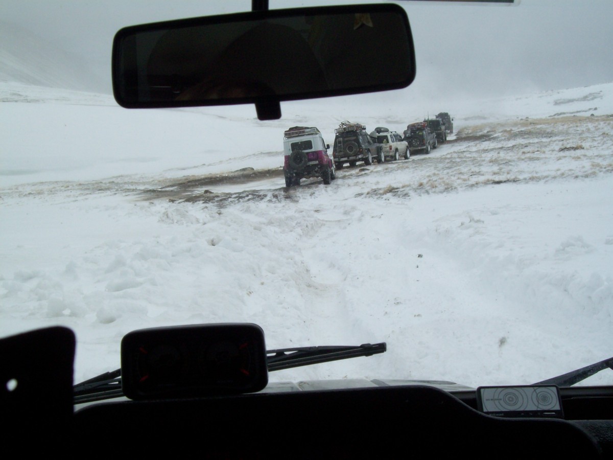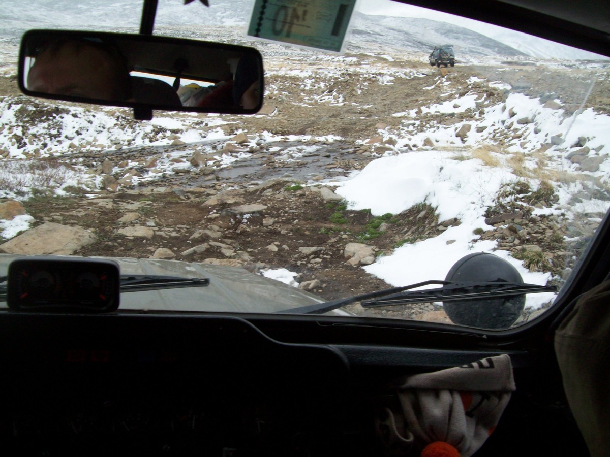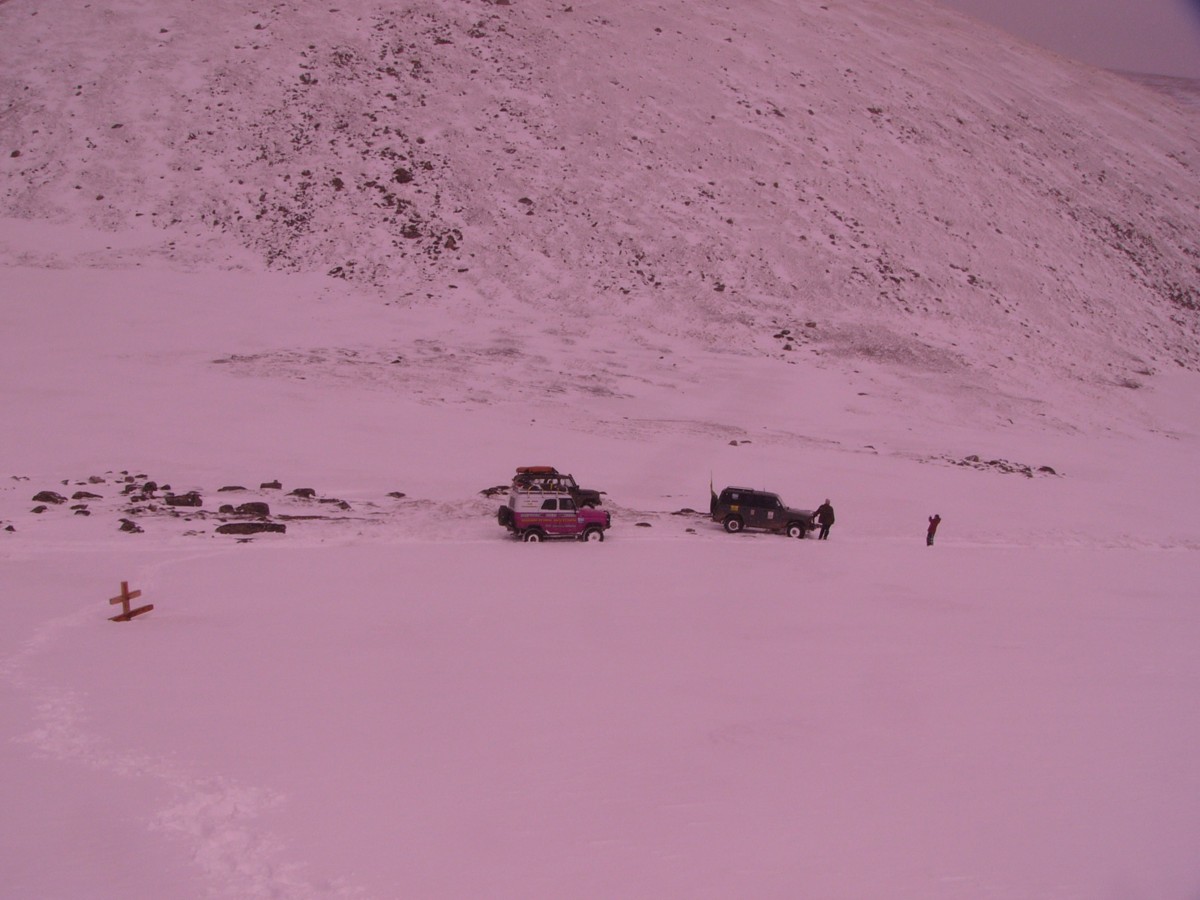 Спустились Ольга и Д.Н сидят в машине, жрут помидоры, пьют, мы присоединились, зовем Евгению, которая сидит рядом в машине мерзнет, та ни в какую, не всем по кайфу высота. Рюмочку, другую за перевал, за подъем, за покорение 3000. Наконец подтянулись остальные, время не смотрел примерно 15.00 За 6! часов мы все без потерь и поломок взяли перевал. УРА! Начинаем спуск, я чуть отвлекаюсь и слетаю с пробитой в снегу колеи, утыкаюсь в сугроб, повис.