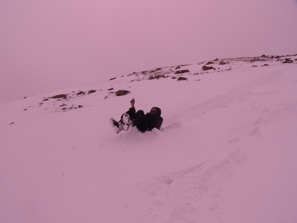 Короткий перекур, фотки на память, начинаем спуск. Классно… ложишься на спину и скатываешься, правда не долго, снег рыхлый и постепенно зарываешься в него. Пожалели, что не подумали о спуске и не взяли с собой карематы.