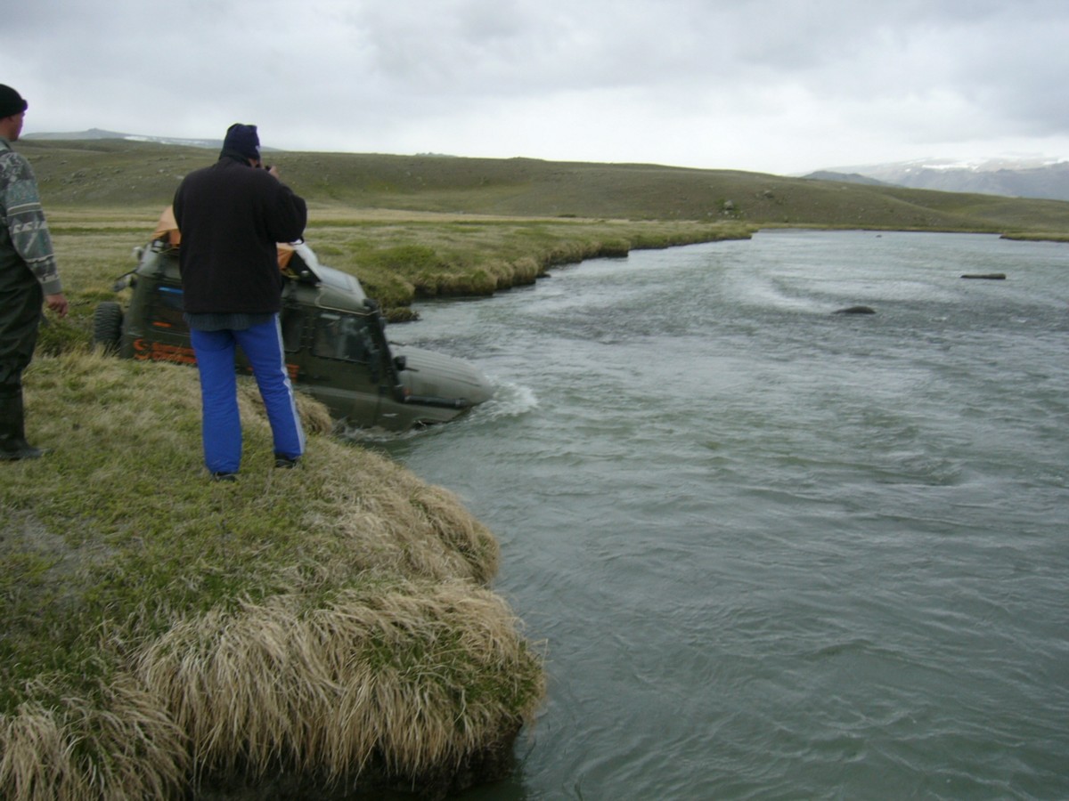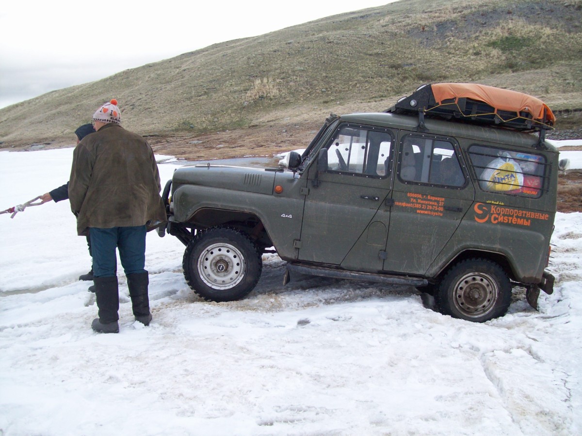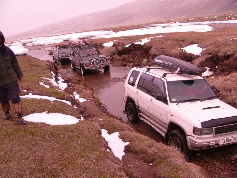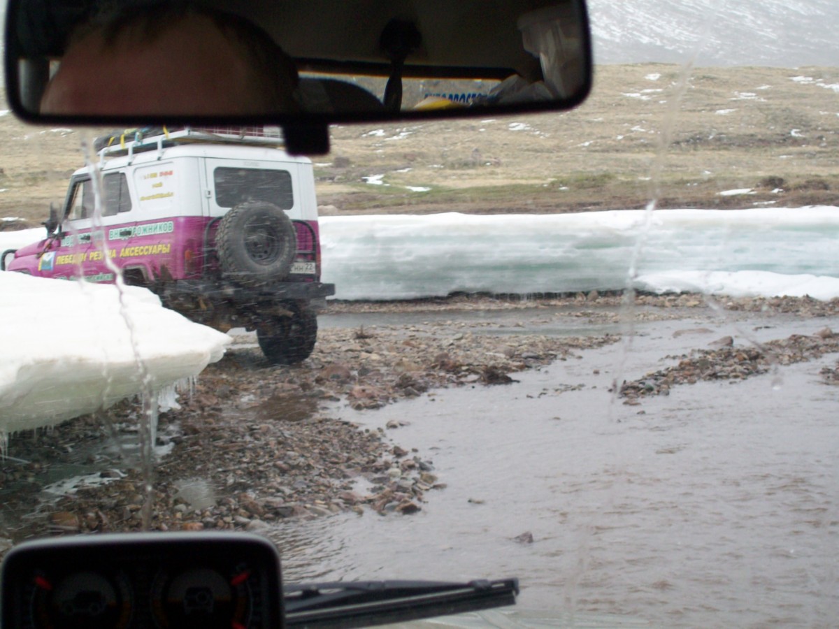 Я иду с пограничником отмечать пропуска, разговариваем почти не о чем, попутно выясняя, что с начала года на Укоке уже побывало около 30 человек, проторчал у него около часа. Все.. отмечены, переписаны, проинструктированы, начинаем движение дальше. Впереди после небольшого подъема и спуска новое препятствие – речка и на ней лед, края подмыты водой. Первая машина проходит легко, мы за ней. Под задними колесами предательски ломается лед, и мы садимся на кузов.