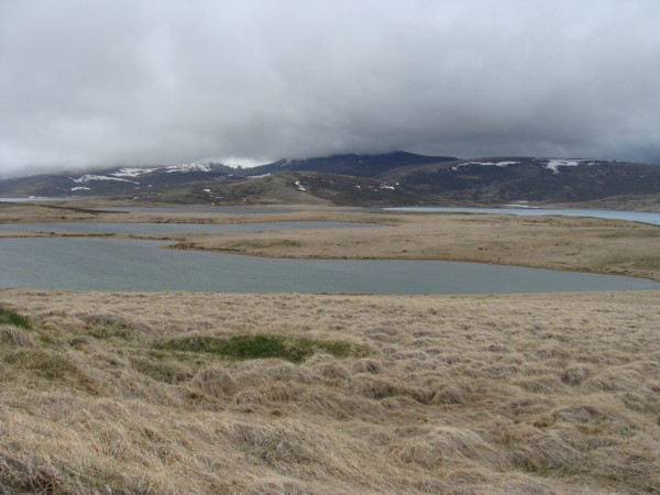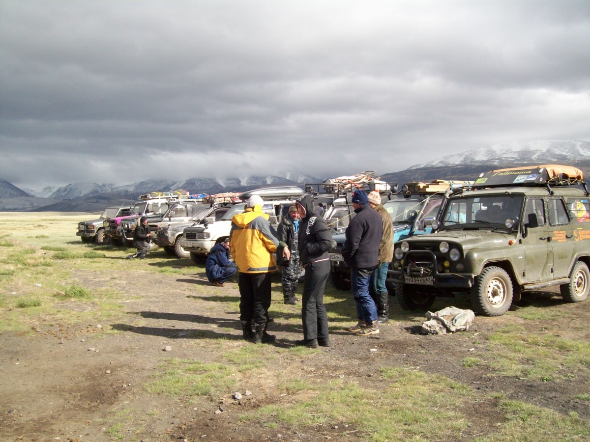 Фотографируем, издали видно, как в одном из озер плещется рыба, на другом полно всякой водоплавающей дичи, а следующее вообще еще покрыто льдом, лишь по краям небольшая полоска воды. Ветер на улице просто жуть, так и прорывается сквозь одежду. Часть машин рванула вперед в поисках возможного места стоянки и защиты от ветра. Стоим ждем. Все возвращаются, замешкался только Олег, проехать на подветренную сторону ни как, вода, болото, земля кругом сырая, пропитанная влагой. Ни чего не остается, как возвращаться в Бертек, там хоть какое место с относительно слабыми порывами ветра можно найти. На обратной дороге слегка садимся в болотину, резина дерьмо. Попытались выйти ни как, ждем, опять нас быстро выдернули, благо закопаться и провалиться не успели. Да и проваливаться особо там было некуда, через 30-40 сантиметров вечная мерзлота. Выдернули, едем. Колонна что растянулась, стоим ждем. Кто-то подъезжает, говорит, что у Полянского закончилась горючка в доп. баке и при переключении на основные баки, УАЗ качать горючку не хочет. Что-то делают. Нам ждать из-за нашей тихоходности (багажник совсем разболтался, того и гляди грозит слететь, в месте с нашим не хитрым скрабом) смысла не было, потихоньку поехали мимо Бертека к предполагаемому месту стоянки. Накрапывал дождик, разбивать палатку и готовить еду под дождиком нам не очень хотелось. И мы немного вернувшись останавливаемся в одну машину в знаком нам уже домике. Готовим гречку с тушенкой, едим, пьем, ложимся спать.