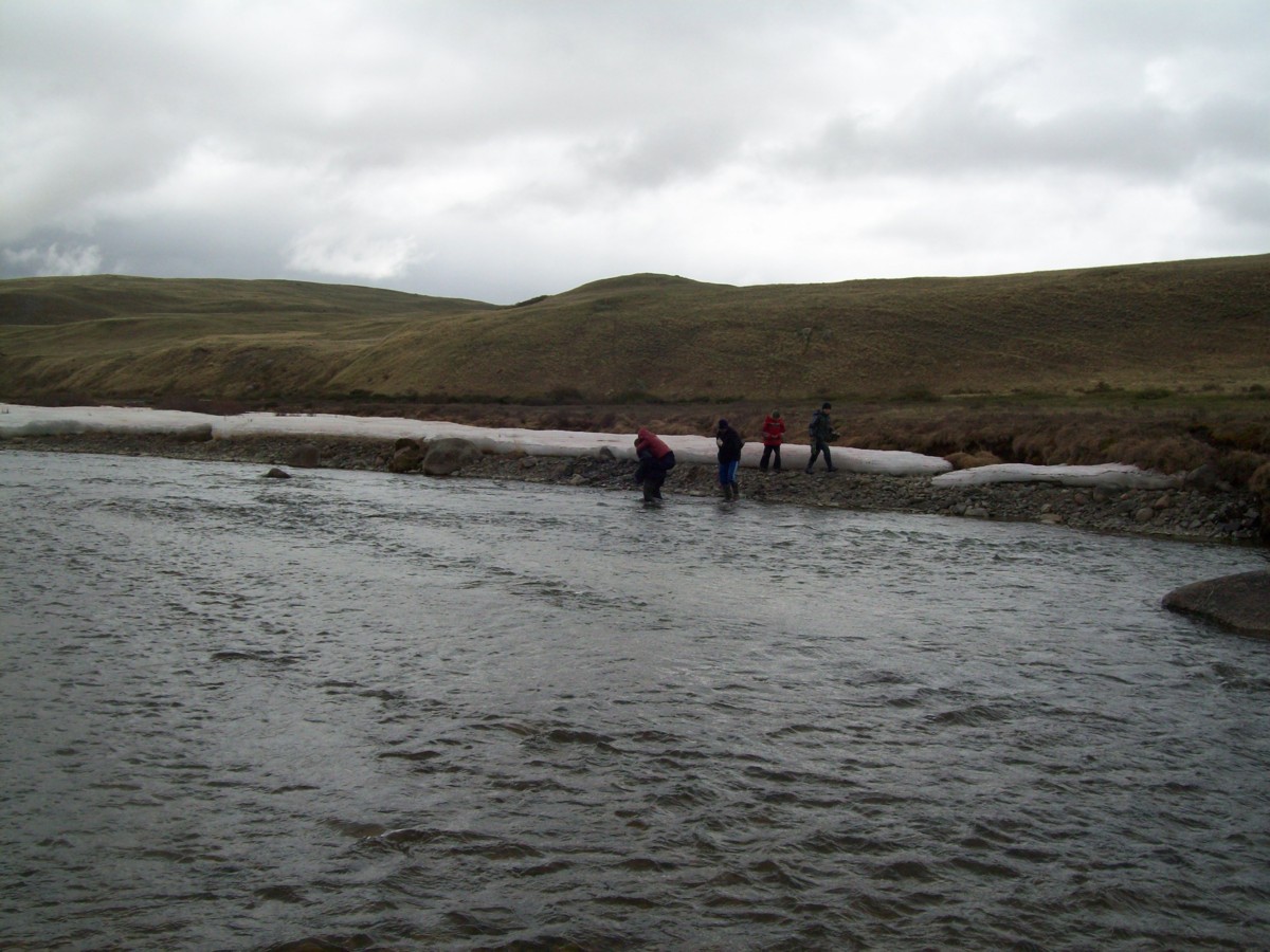 Дальше доверившись навигатору, стали забирать правее. А зря… надо было уходить влево. Подъехав к Калгуты неожиданно наткнулись на выскочившую и пустившуюся от нас на утек лисицу. По фотографировали, посвистели ей в след. В том месте, куда мы приехали, пересечь Калгуты на машинах было не реально, кругом по берегу большие камни, лед, а на той стороне еще и крутой подъем. Я предлагаю в брод и пешочком, девчонки артачатся, болотники одни на всех, уговорил. Беру на спину сначала Ольгу, переношу на ту сторону, тяжело. Иду назад беру на спину Женю переношу, очень тяжело. Опять возвращаюсь, беру Серегу, он легче, после двух девушек словно пушинка.