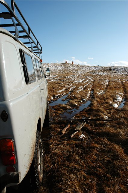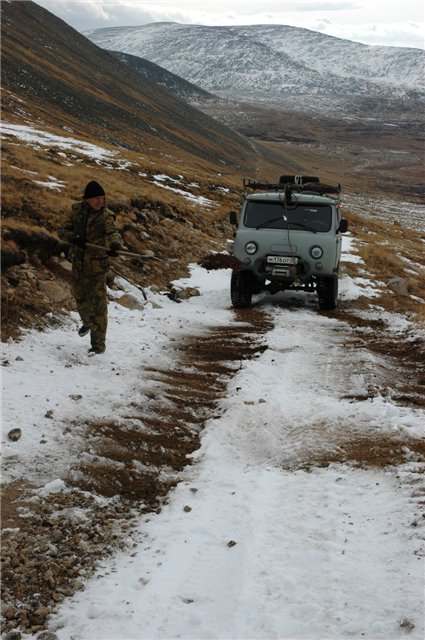Полезли на высоту 2900 м-неудачно,хряснула полуось на заднем мосту.Дальше пешком,непривычно как-то.