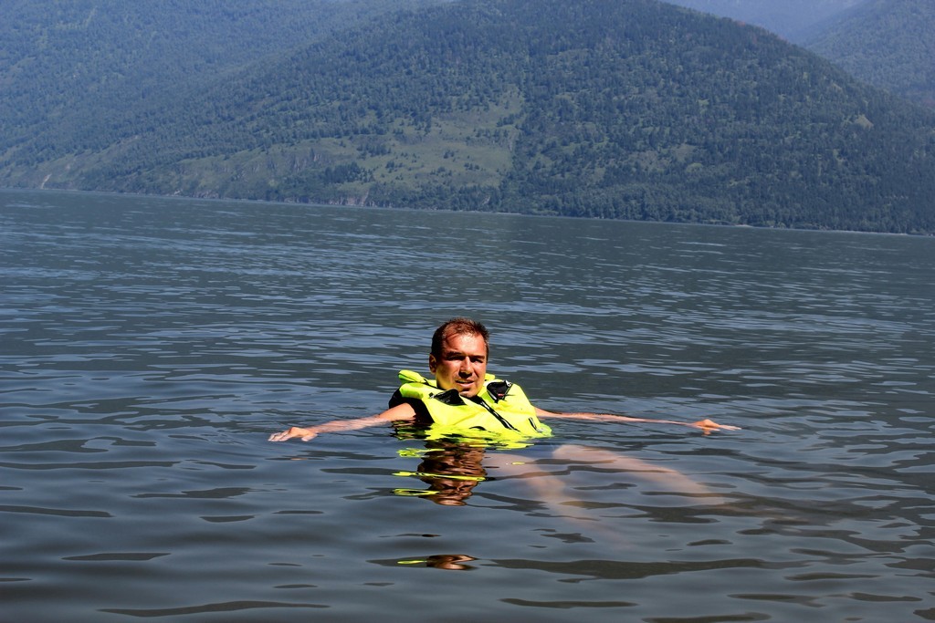 Иногда на Телецком попадаются и такие туристы, которые просто живут на воде. Из надувных балонов сооружают плот, на него ставится палатка, мастерится парус, а сзади вешается лодочный матор. Таким образом они дрейфуют по всему периметру озера, останавливаясь и причаливая в наиболее понравившихся местах.