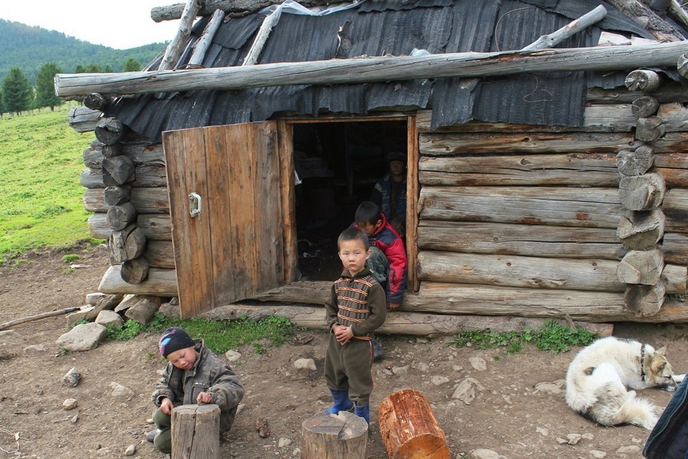 Только к вечеру мы доехали до горного склона где находилась нужная нам стоянки. Два небольших аила и большие загоны для животных. На моё удивление взрослых никого не оказалось, только четыре маленьких мальчишки от 3-х до 5-ти лет, да три лайки. При нашем появлении они сначала попрятались, но потом увидев родного дядю выбежали нам навстречу (племянники как-никак) и с любопытством начали нас разглядывать.