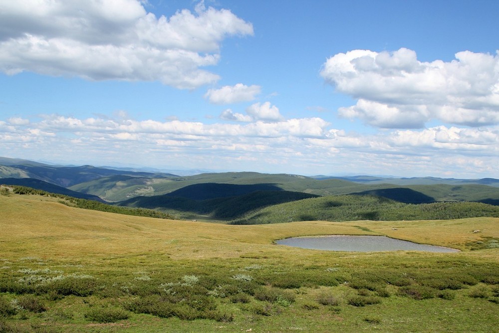 После 6-часовой езды без дорог взобравшись на очередную горку мы наконец увидели небольшое озеро. Но спуститься к нему оказалось не так то просто. На спуск ушло ещё 1,5 часа. И вот мы на месте. Вода в озере чистая, прозрачная как стекло. Около берега хорошо видны многочисленные струйки пузырьков. Тоже радон. А вокруг девственная красота. Взору открывались отвесные скалы Айгулага, перемежающиеся с горными долинами, множество озёр больших и маленьких, голубых и зелёных. Оставшееся время до захода солнца мы обследовали окрестности пешком, поставив лагерь на берегу озера. Синее небо, звенящая тишина, величественные снежные вершины, заросли вереска и золотого корня – природа открывала перед нами свои богатства.