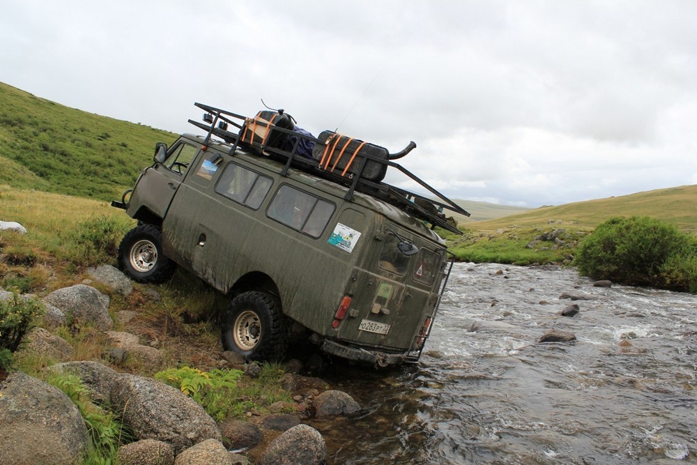 Спустившись с перевала мы заночевали на речке, т.к. уже начинало смеркаться и ехать в незнакомом направлении в темноте не хотелось. На следующий день приключения продолжались. Несмотря на проложенный по навигатору маршрут мы промахнулись с поворотом, а так как было сто дорог – одна твоя мы сбились с курса и проплутали полдня, нарезав лишние 130 км. Правда произошло это не без помощи тувинцев, потому что обращаясь к ним за помощью в поисках верной дороги мы получали массу противоречивых объяснений по поводу направления. Все как один показывали в разные стороны, короче совсем нас заморочили. В конце концов когда по навигатору оставалось 6 км до озера мы поняли, что находимся за хребтом от нормальной дороги и нам его придется штурмовать по еле заметным дорогам тувинцев. Мы поехали вдоль бурной речки и на выходе из неё со всего размаху повисли на огромном валуне. Машина почти легла на бок, у нас с Сашей сердце остановилось. Что делать? Вокруг на многие десятки километров ни души, связи нет…пытаться насиловать мотор – опять порвать полуоси и тогда точно всё, капут. Короче размотали лебёдку и через блок вытащили нашу машинку.