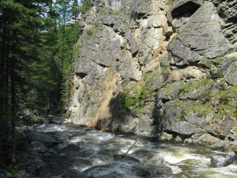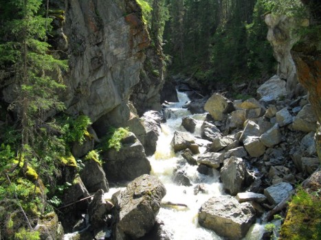 И вот наконец мы отправились в гости к нашему таёжному отшельнику. Переправившись на лодке через Башкаус пройти предстояло сначала по узкому ущелью, где стремительно несла свои воды горная речка, затем по тайге вдоль уже известной нам тропы.