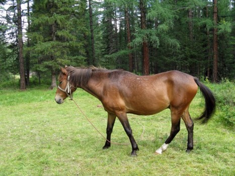 Только верный конь Султан мирно жуёт травку поджидая своего хозяина.