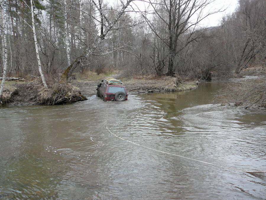 Подъехали к устью Мал.Татарки. Дело к вечеру, а мы ещё на полпути к Бол.Татарке. Решили не бродить, а подстраховаться. Накинули трос на крючки, и первый пошел.