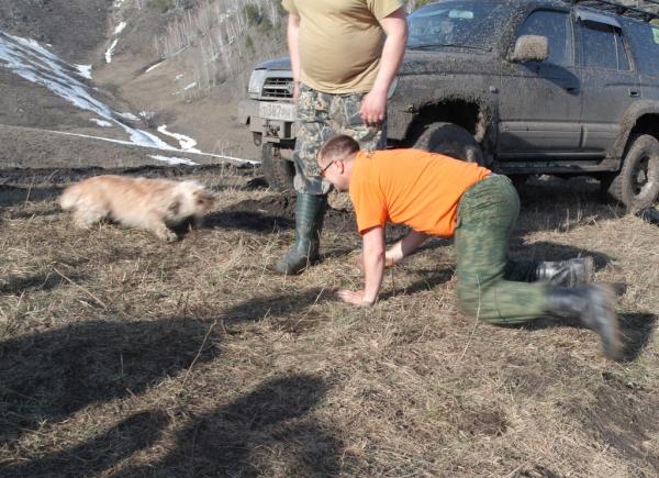 сабачке стало страшно в багажнике, ведь она там была не одна, а со всеми посылками переданными в Барнаул, когда я открыл дверь, то едва успел поймать поводок. Решил, что около дерева, рядом с дорогой ей будет спокойней, а на обратном пути заберем. но застряли и долго ждали помощи. виноват товарищи