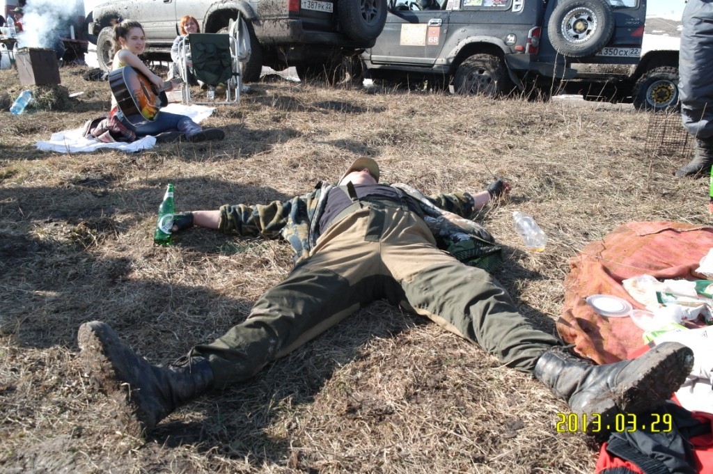 По утру красивая колонна из трёх десятков ЖИПОВ двинулась на штурм горы Толстуха. И , о чудо ,вместо снега видим смачную грязь с колеями и лужами . После первых промоин треть колонны пожалели ЖЫПЫ . Остальные садисты своих машин, приняв допинг, по....али дальше. Всё нормально, всё привычно, но после речки ЖЫПЫ и их хозяева поняли , что подъём по мокрой земле в формате 3D особо интересен. Тут колонна ещё раз разделилась на две части: полусосисочники и реальные Жыпо-убийцы. Но была ещё и третья безумная категория: одинокий пехотинец Н Бузало. Которая под видом поиска клозета-забралась на Толстуху пешком. Уставшая но довольная,она,поймав на вершине оффроад такси, была доставленна к Уазычу в лагерь.
