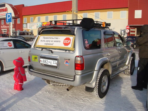 В 11:00 (мест.) к стоянке у Гипермаркета приехали автивисты Алтайской федерации автомобилистов. Здесь около 50 автомобилей были украшены протестной символикой и плакатами, на которых можно было прочесть \"Хватит грабить народ\", \"Поднимайте уровень жизни, а не пошлины и цены\", \"Нет повышению транспортного налога\", \"Да свободной конкуренции\", \"Правительство, вынь руку из моего кармана\" и другие.