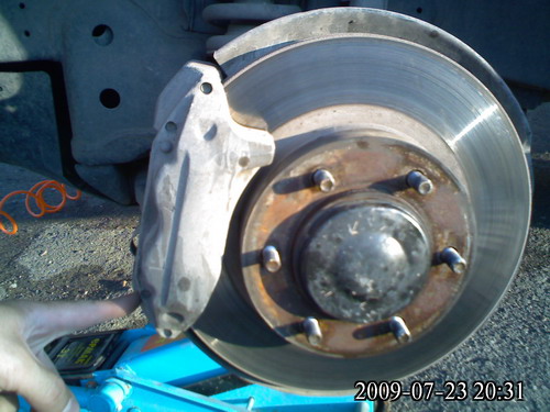 Потратил пол дня, чтобы АРОшку разуть... 1160 рублей на шиномонтаж с балансировкой чтобы натянуть снятую с АРО резину на купленные 15" диски, обул задние колеса - все замечательно... а как начал передние колеса обувать - выяснилось, что тормозные суппорта (или как эта фигня называется на которую я на фотке пальцем кажу) не входят во внутрь этих 15" дисков