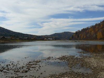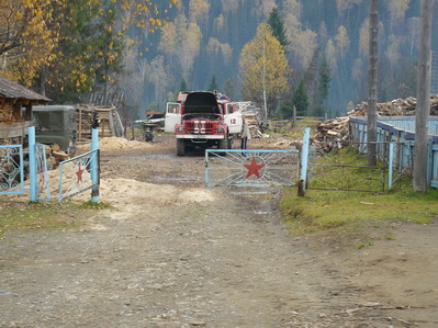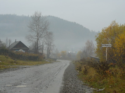 Местное и неместное население поселка встретило нас с умеренным интересом. Проходящий мимо целый полковник в чистом бело-серо-синем камуфляже, контрастирующем с окружающей обстановкой, строго посмотрел на нас, но ругать не стал. При разговоре с местными мы узнали, что въезд в поселок со стороны Междуреченска через шлагбаум, которого со стороны гор естесственно нет. Нет шлагбаума и на дороге, ведущей к Балыксе - волшебному для нас слову, ассоциировавшемуся со словом асфальт. До Балыксы 80 км. реально существующей дороги. Мы успокоились и под накрапывающий дождик переехав мост уходим с Ортона направо на Балыксу.
