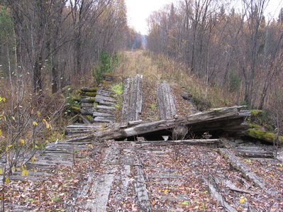 ...переходит к промоинам, где-то заваленным лесом, где-то нет...