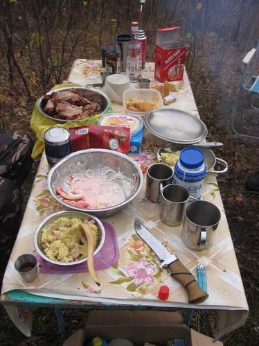 ...первого дня закончились как и полагается - накрытым столом. Немного сумрачное настроение, связанное с тем, что до Таштагола обратно 100 км., впереди нас ждала неизвестность и судя по картам еще километров 150 до асфальта, и мы хрен знает где, улучшилось после пары стопок спиртного.