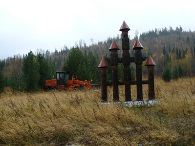 Перед сиим постаментом обнаружили пробитый в Горной Шории на Паджере бак, ремонтом которого и получением пропусков в погранзону занимались весь следующий день