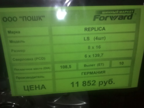 Наткнулся сегодня на диски: маг. Форвард, Космонавтов, 14/1. ALESSIO на запаски: в наличии два с нулевым вылетом, один 10 вылет. REPLICA комплект: 4 шт. немного пострадали при транспортировке, в цене обещали подвинуться. По инету глянул REPLICA в пределах 5 рублей шт.