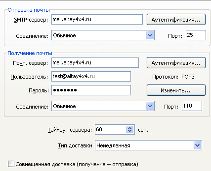 Члены клуба имеют возможность зарегистрировать на свое имя почтовый ящик в домене altay4x4.ru. Для настройки программы используйте следующие настройки: