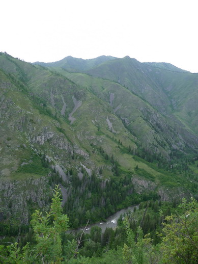 Дорога до Онгудая при протяженности 400 км. заняла 6 часов времени. Расположившись на т/б Янтарный сад, она же Отдохни, едем на разведку. Между Онгудаем и Хабаровкой уходим налево по правому берегу р. Урсул. По карте до р. Катунь 15 км. Семь из них проходимы для легковушек. Неплохие места для семейного отдыха. Проехав еще 4 км., через небольшой подъем (на фото) и спуск, слева видим небольшой хуторок и поле конопли, про которое слышали от других джиперов. За хутором дорога упирается в забор дальше идет конная тропа.