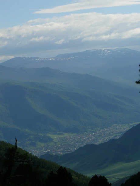 Из самого с.Каянча, состоящего из пяти домов, перед домом на пригорке дорога, по котрой давно не ездили, уходит влево. Карта показывает, что через безымянный перевал она выходит к с. Н.Талда. К сожалению наличие детей в экипаже не позволило это проверить.Возвращаемся на превал, с которого открывается вид на Онгудай. До Онгудая с перевала 15 км.