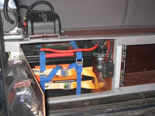 В аккумуляторный отсек рундука установлен дистанционный выключатель дополнительного АКБ и туда же вынесен блок предохранителей задних прикуривателей, заднего света люстры и т.д.