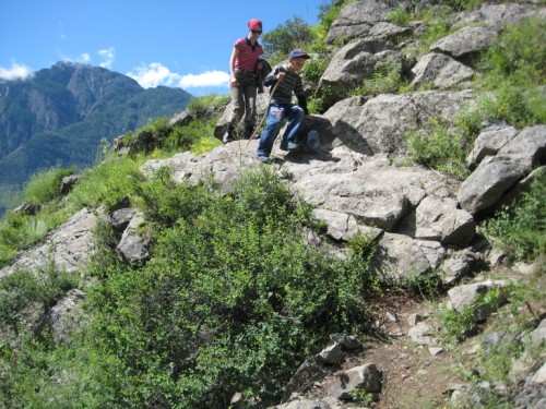 Привезав сына к себе страховочной веревкой и немного помогая ему при прохождении тропы, мы без особых проблем перебрались вдоль скалы. Пока я отвязывал его от себя, Людмила уже почти перешла вслед за нами: