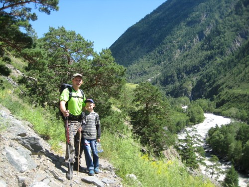 Тропа, надо честно сказать не самая легкая. Т.е. летом в сухую погоду вполне нормальная, но я шел и думал, как бы мы шли по ней в мае по еще лежащему снегу и наледи на камнях. Если сейчас на местах с отвесными склонами камешки сыпались из под ног в бурную Чульча, то что из себя представляет мокрая и обледенелая весенняя тропа....: