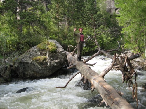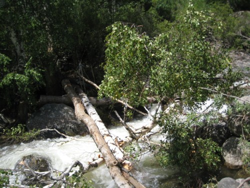 И вот последнее препятствие - бревно через Чульчу. Но по ширине оно почти как нормальный пешеходный мостик, к томуже в самой опасной части даже есть нечто на подобе поручня