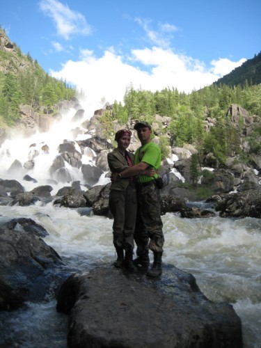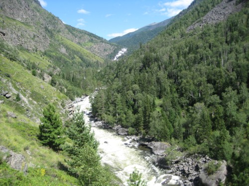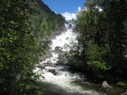 Во время очередного коротенького привала на нас вышла охрана заповедника и сообщила, что оказывается присутствие на территории заповедника платное. Я объяснил ребятам, что заплатить я не против, но какус данной ситуации состоит в том, что нас никто не предупреждал, что здесь платная зона и я не счел нужным брать с собой деньги в прогулку на водопад, поэтому, если нужно нам купить билеты, то на том берегу Чулышмана стоит наша машина, и как мы вернемся обратно, то подойдите туда я отдам вам деньги. На том и порешили. Поинтересовавшись протяженностью тропы мы получили ответ, что мы еще в самом начале и как мы увидим вдалике водопад, то это будет ровно полдороги туда. Не могу сказать, что меня это сильно вдохновило, но ведь и выбора никто другого не предоставлял и мы двинулись дальше ))) И вот через какое-то время после поворота Чульчи вдалике мы увидели ЕГО.
