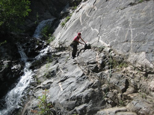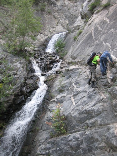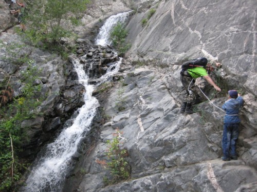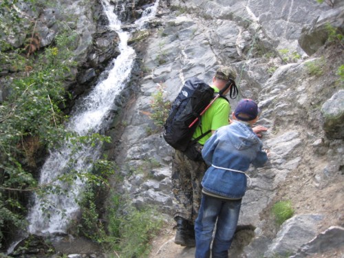 Путь назад всегда короче, а зарядившись энергией водопада, я даже не заметил как мы добрались до скалы. Опять привезав сына для страховки к себе , мы стали перебераться по этому участку
