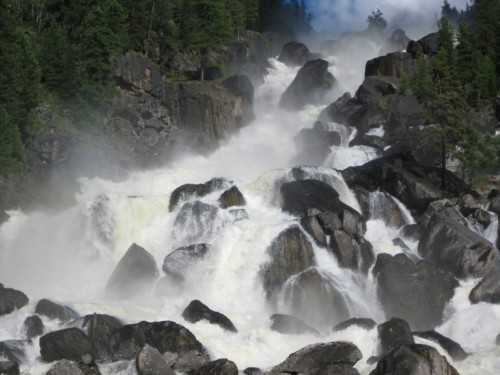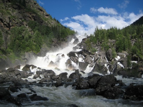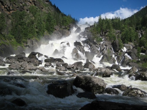 А вот и цель нашего маршрута. ОН - УЧАР. По данным инета, считается самым большим каскадным водопадом Алтая. Высота около 160 метров, хотя по некоторым данным высота падения Чульчи на этом участке составляет до 250 метров. Впечатления от него неоднозначные - его сложно назвать водопадом, это больше похоже на водоскат или что-то подобное, но грандиознасть и мощь поражает. Вот его точно не передать фотографиями.