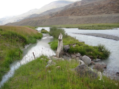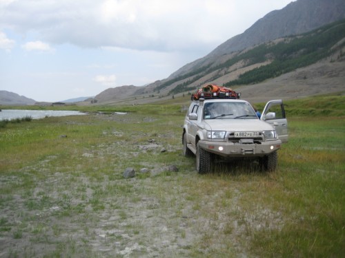 По дороге смотрим на следы - следов УАЗа Таежников не видно нигде (хотя накануне прошел дождь). Короче делаем вывод, что раз до обеда 9 числа от них так и небыло известий, хотя бы в виде СМС (я ведь просил в любом случае отослать сообщение, когда они выдут в зону связи), то видимо они еще в районе Аргута или Белухи, а значит встретится нам здесь не суждено. Ветер поднялся очень сильный, небо заволокло опять тучами и начался дождь. Оставаться здесь в одну машину было не охота - место не нравилось само по себе, к тому же холодно и мокро. И мы доехав до зимника Талдура решаем вернуться назад в зону связи и переждать еще день - а там решим, что делать.